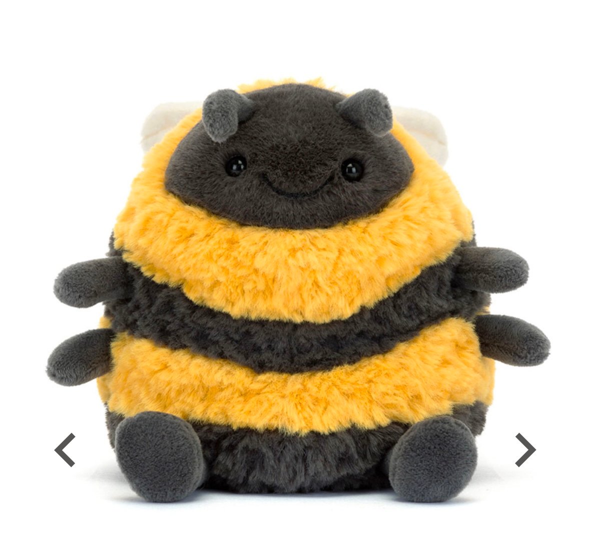 Albee Bee is the happiest little bumble. In thick yellow and black striped fur with little charcoal legs, Albee has a matching face with curved antennae. With a big, stitched smile and soft cream wings, Albee spreads springtime joy all year long!