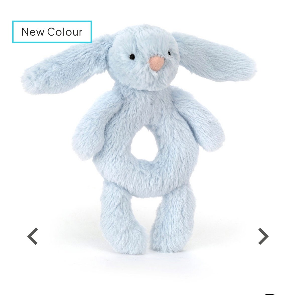 A treat for tiny hands, Bashful Blue Bunny Ring Rattle can be grabbed by its soft paws, long lop ears or ring-shaped tummy. When given a gentle shake it will sound the rattle inside, much to baby’s delight! Crafted in a blue coloured fur made from recycled fibres featuring a Bashful Bunny pink suedette nose and embroidery eyes