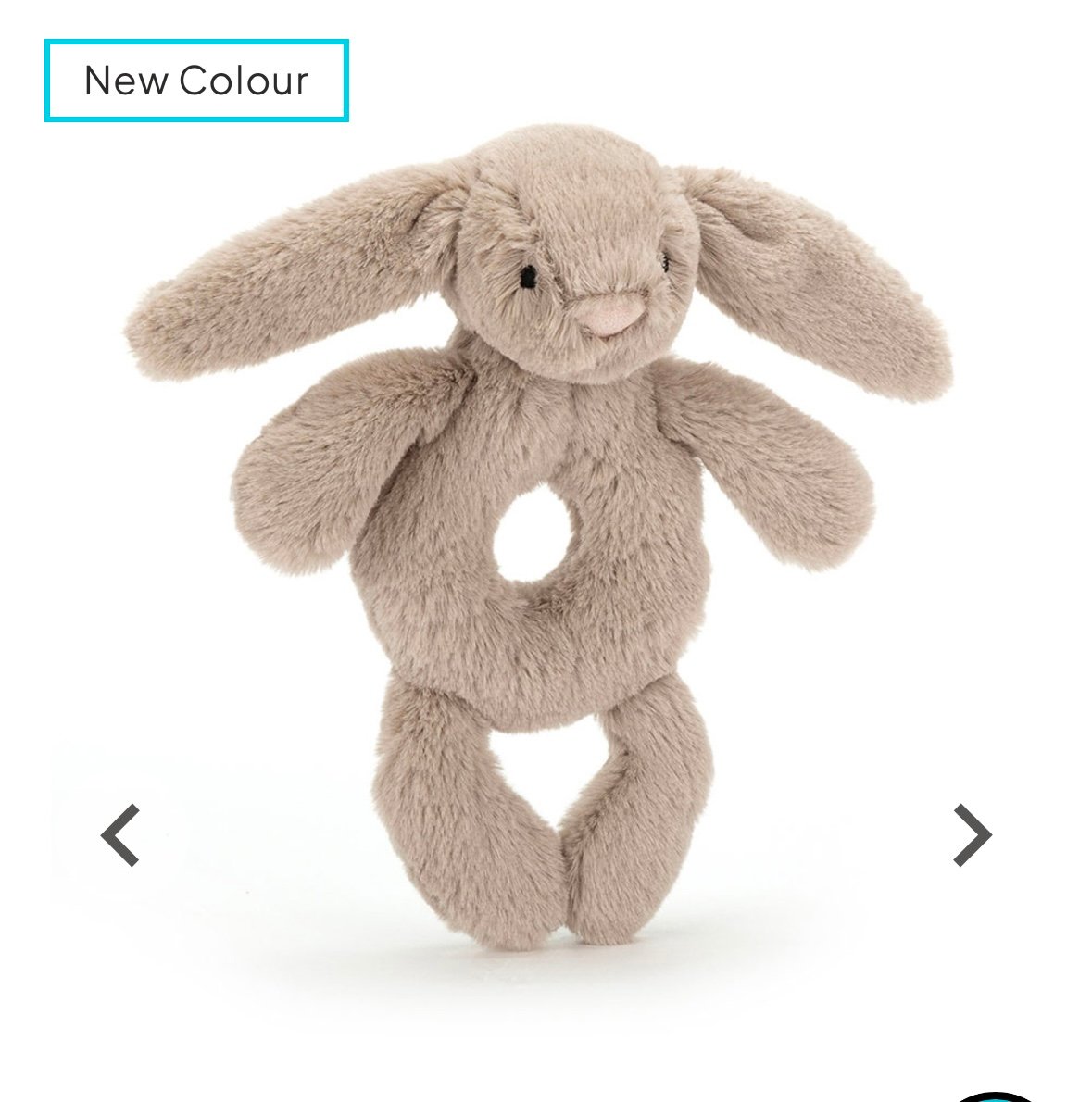 A treat for tiny hands, Bashful Cream Bunny Ring Rattle can be grabbed by its soft paws, long lop ears or ring-shaped tummy. When given a gentle shake it will sound the rattle inside, much to baby’s delight! Crafted in a cream coloured fur made from recycled fibres featuring a Bashful Bunny pink suedette nose and embroidery eyes.