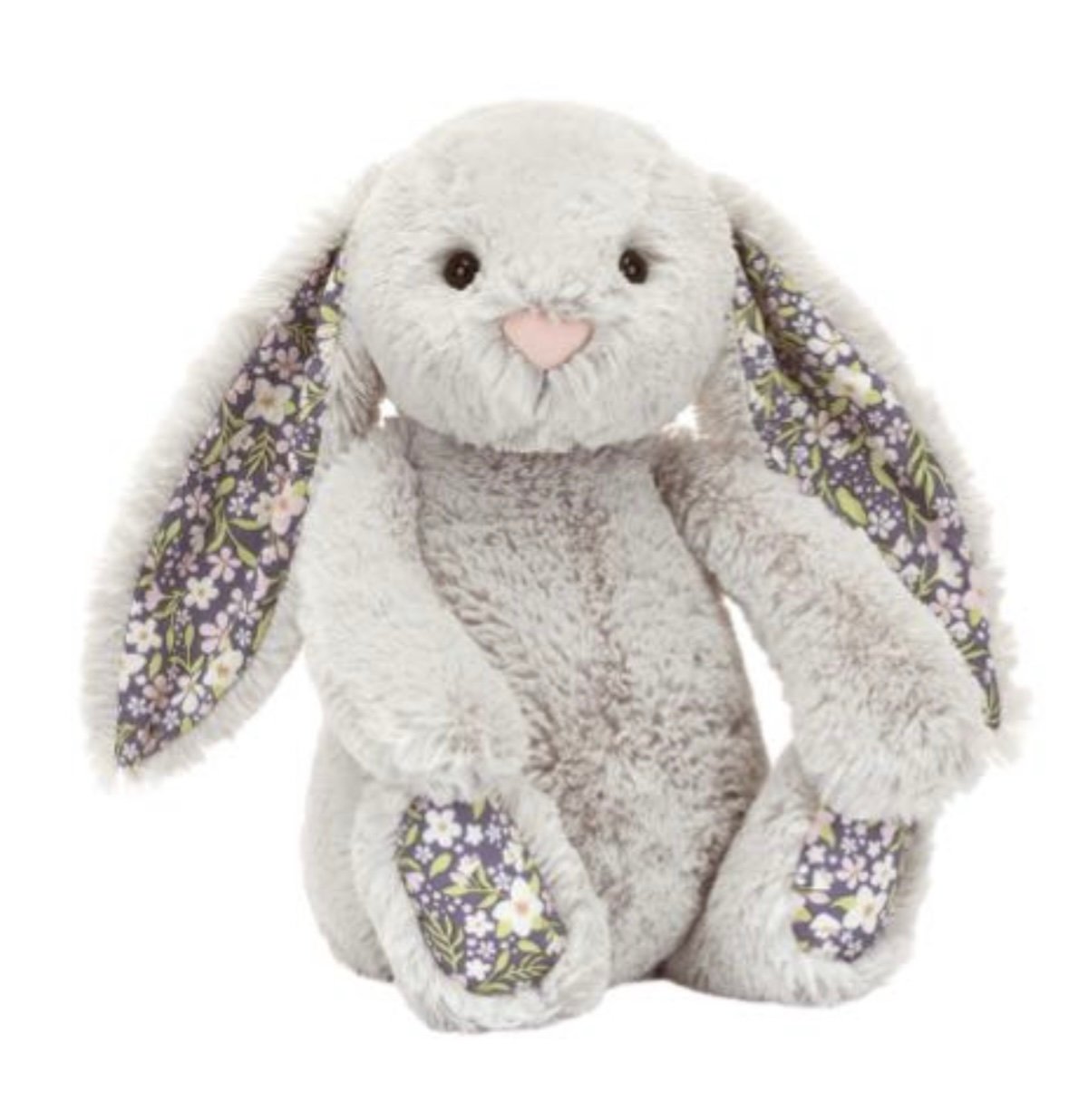 Blossom Silver Bunny loves to go for a midnight stroll among the flowerbeds. In iconic silver-grey Bashful fur with a cream bobtail, Blossom Silver Bunny has soft cotton floral ears and feet, printed with an original Jellycat design of pink and white flowers scattered among a midnight blue backdrop. The perfect nighttime companion for all ages.