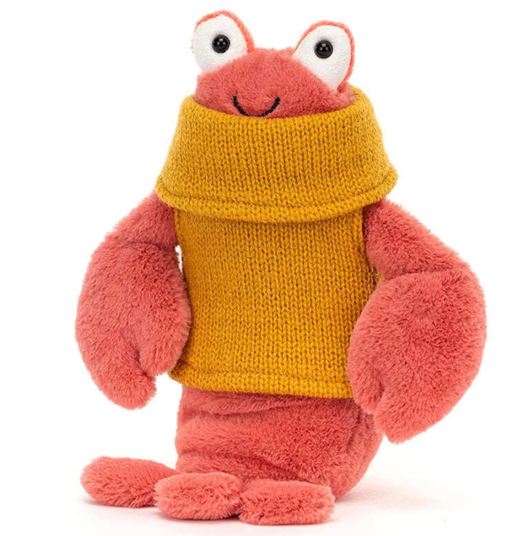 Jellycat Cozy Crew Lobster. This cute little Lobster comes with big bobble eyes, soft peachy-pink fur, a knitted mustard roll-top jumper and a broad smile. If you are looking for a super cute, seaside friend, this soft chunky clawed chappy could be the perfect pal. Introducing Cozy to a real lobster could be some real fun! For a closer look at Jellycat's Cozy Crew Lobster simply roll the mouse over the image. Do not tumble dry, dry clean or iron. Check all labels