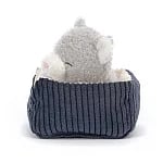 If you lift Napping Nipper Cat up, be very careful not to wake them! This gentle kitten has cloudy-soft fur in soothing pebble grey, with a cream-splash snoot and matching perky ears. All curled up in a cordy blue bed with beautiful buttercream lining, someone's dreaming of scruffles and salmon.